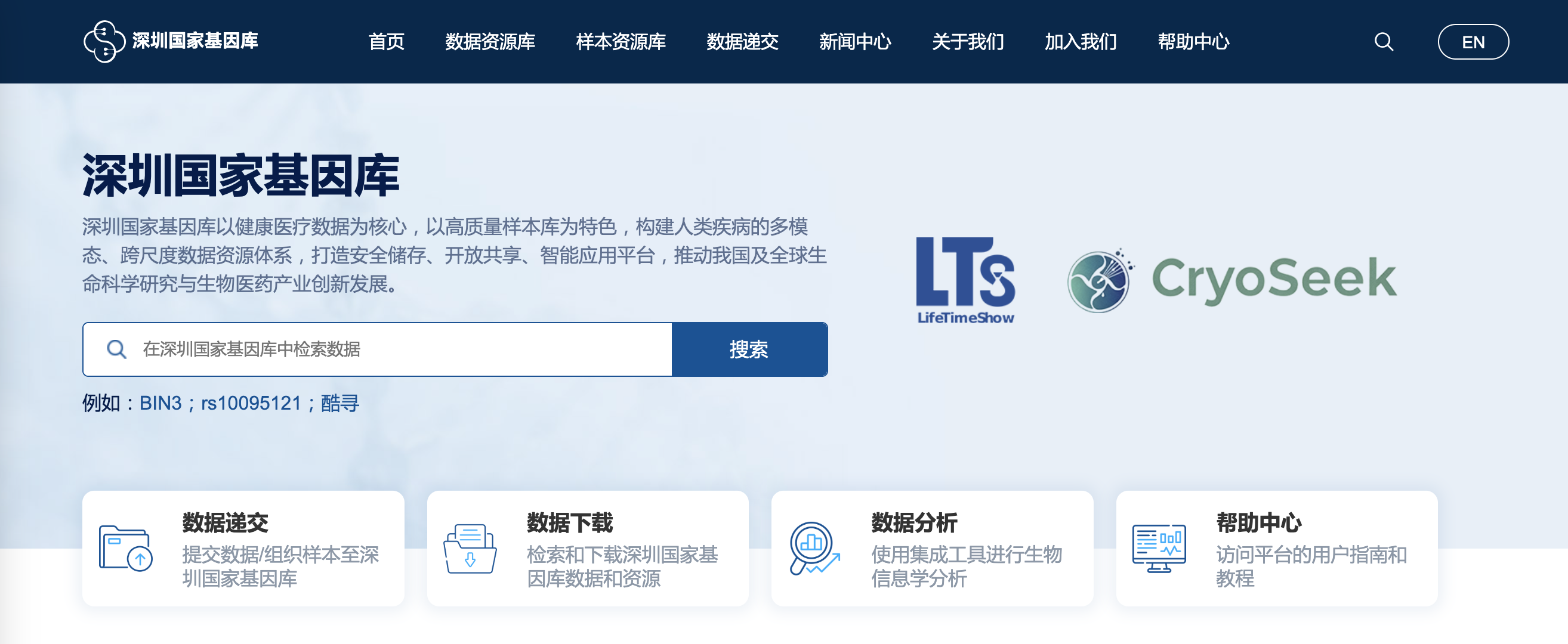 - 国家基因库作为国家级综合性资源库,以健康医疗数据为核心,以高质量样本库为特色,构建覆盖人类疾病的多模态、跨尺度数据资源体系,致力于打造集安全存储、开放共享与智能应用于一体的重大科技基础设施。具体介绍可通过首页顶部栏的 【关于我们】 入口进行了解